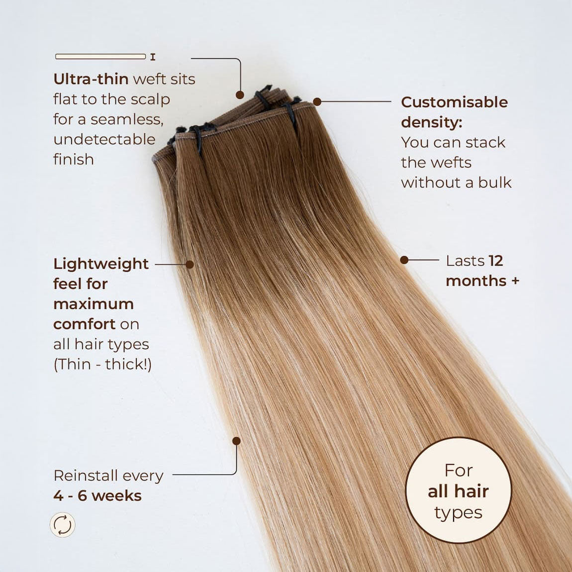 It’s called "invisible" for a reason! These discreet extensions are a hybrid between machine wefts and hand-tied wefts, making them perfect for those with finer hair.
